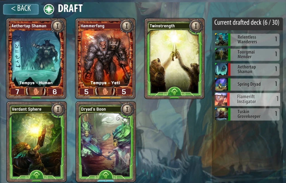 Drafts begin with the player opening a pack that contains six cards of heroic rarity. All packs after that will contain a mix of rarities with most cards being commons and rares and occaisional heroic and legendary cards showing up. Instead of passing the packs around a virtual table where a set group of players pick cards, an algorithm removes cards based on their pick popularity in the larger draft setting. Consequently, more popular cards and cards of higher rarity are less likely to show up as the packs get smaller. Once the pack is down to two cards, a new pack of six is opened. This continues until the player has chosen 30 cards, all of which will be included in their draft deck.